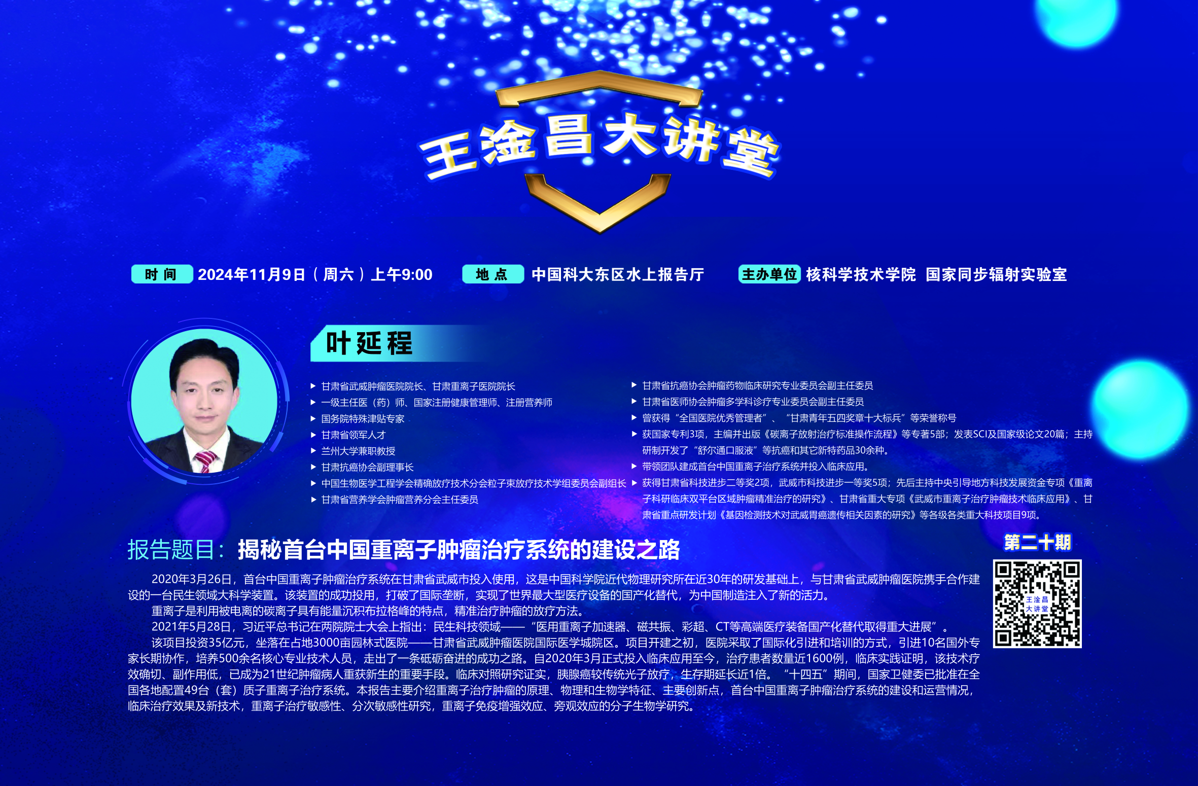 “王淦昌大讲堂”为核科学技术学院、国家同步辐射实验室主办的系列报告会,本次大讲堂特邀甘肃省武威肿瘤医院院长,甘肃重离子医院院长,甘肃抗癌协会副理事长,一级主任医师叶延程教授来我校做报告。