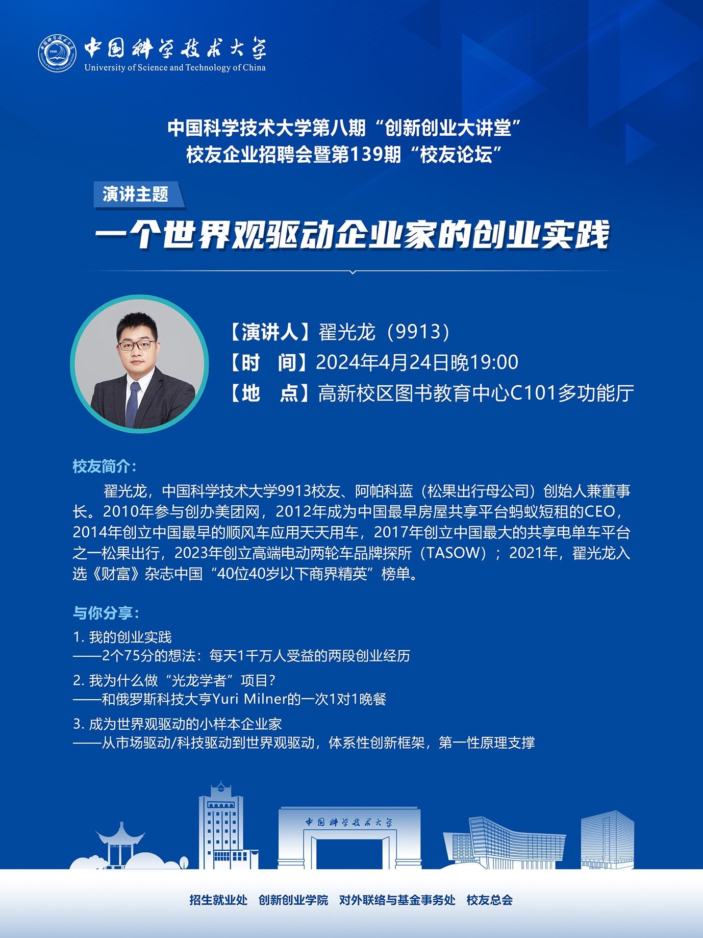 424日(周三)19:00,第八期“创新创业大讲堂”校友企业招聘宣讲会暨第139期“校友论坛”将在高新校区图书教育中心C101举办。我校9913校友翟光龙,阿帕科蓝(松果出行母公司)创始人兼董事长将带来主题为“一个世界观驱动企业家的创业实践”报告分享。欢迎全校感兴趣的师生参加。